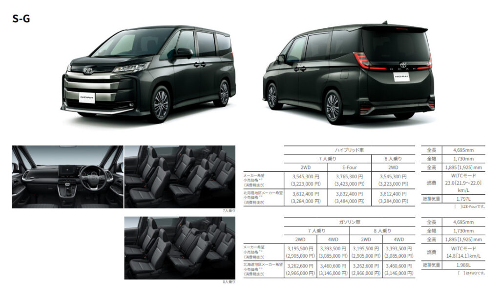数あるグレードの中で、総合的に最もバランスが良いのがS-Gグレードです。このグレードは上級装備を備えながらも価格が抑えられていることと、7人乗りと8人乗りが選べる点、リセールの高さのバランスが取れています。